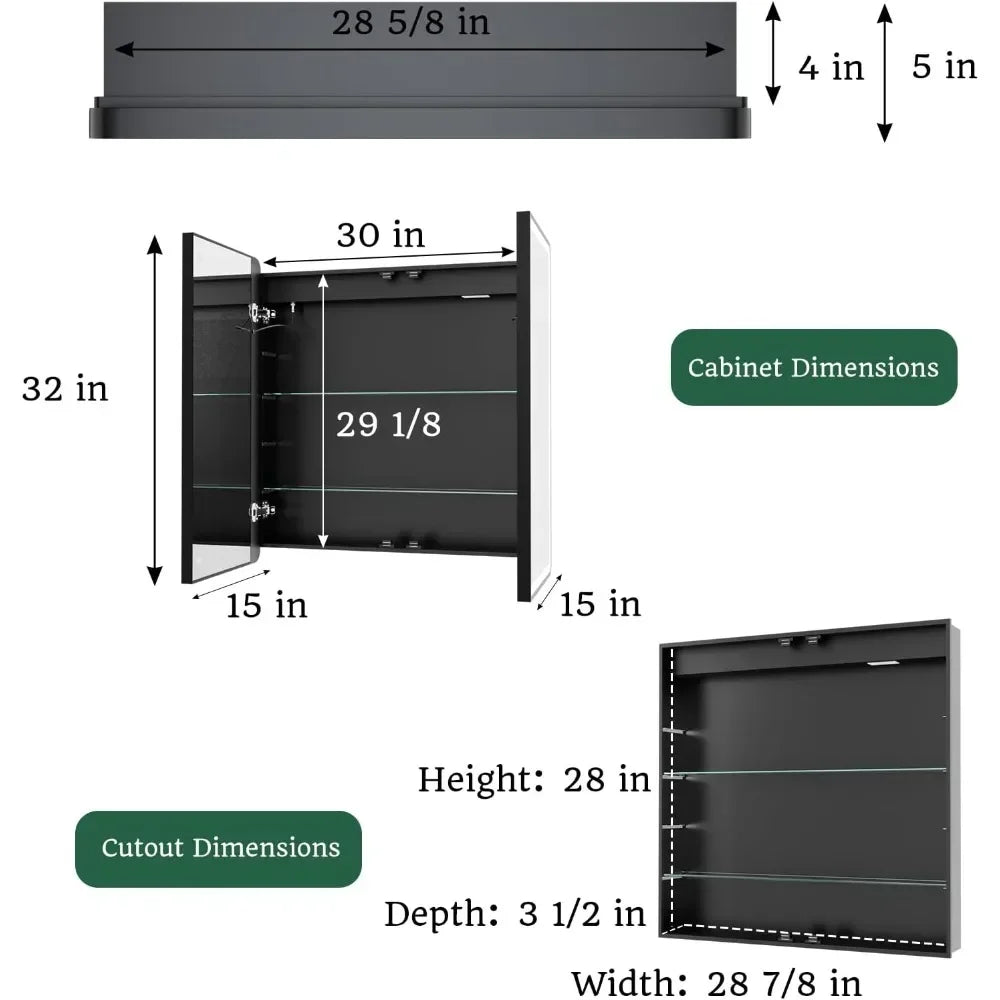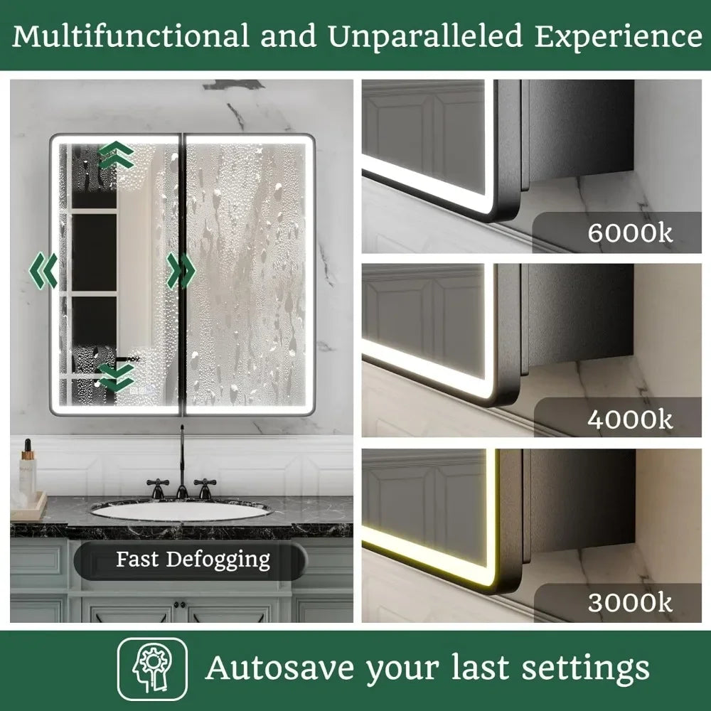 Elevate your bathroom with this 30x32 lighted medicine cabinet featuring a sleek sand black frame. Equipped with adjustable, dimmable LED lighting in three color temperatures, it provides customizable illumination to suit any mood or task. The built-in mirror includes an anti-fog function, ensuring clarity even in steamy conditions. Combining modern design with practical features, this cabinet offers elegant storage and refined functionality for a sophisticated space.