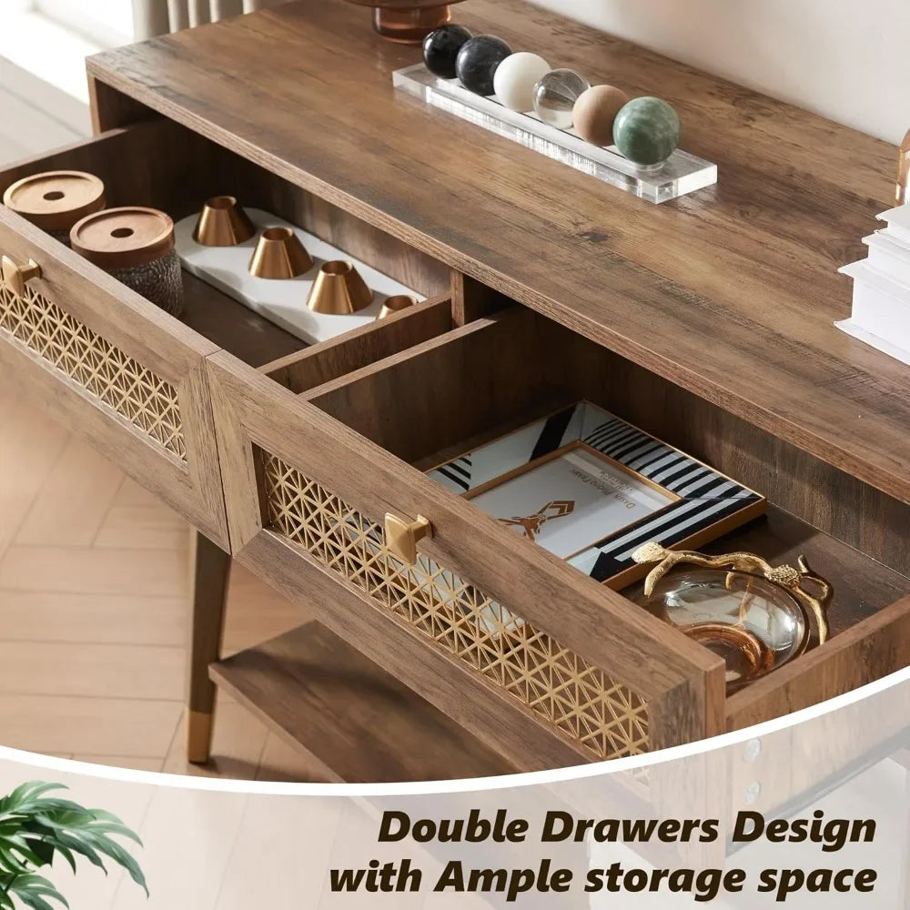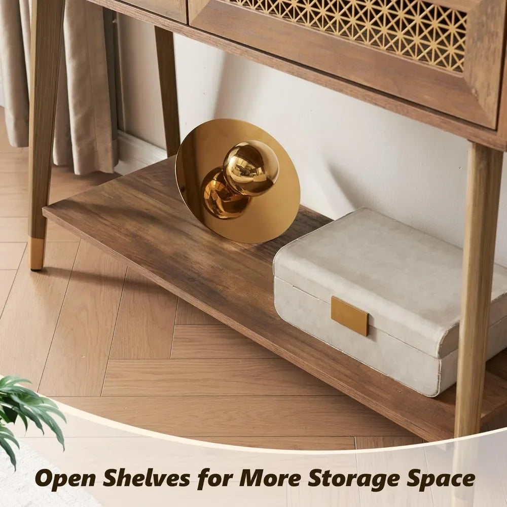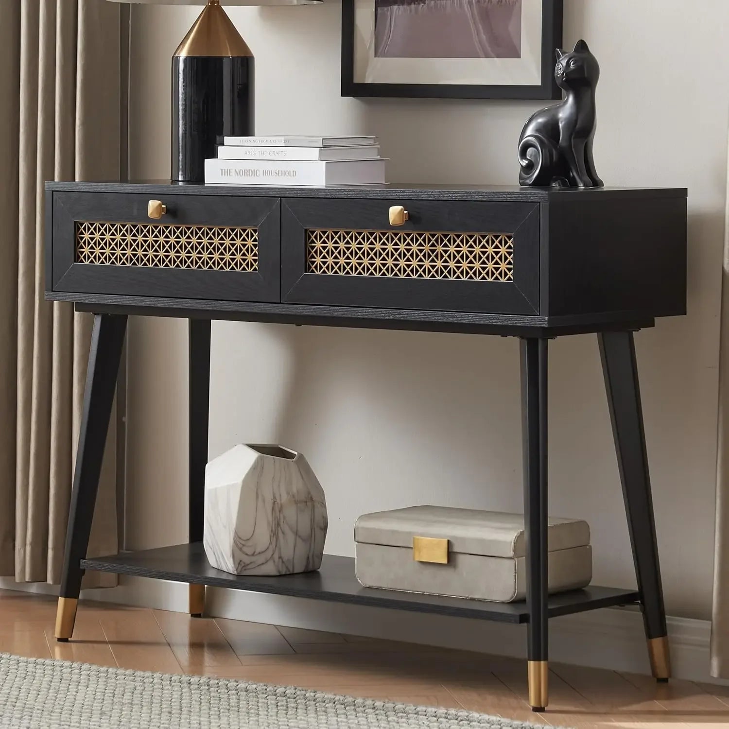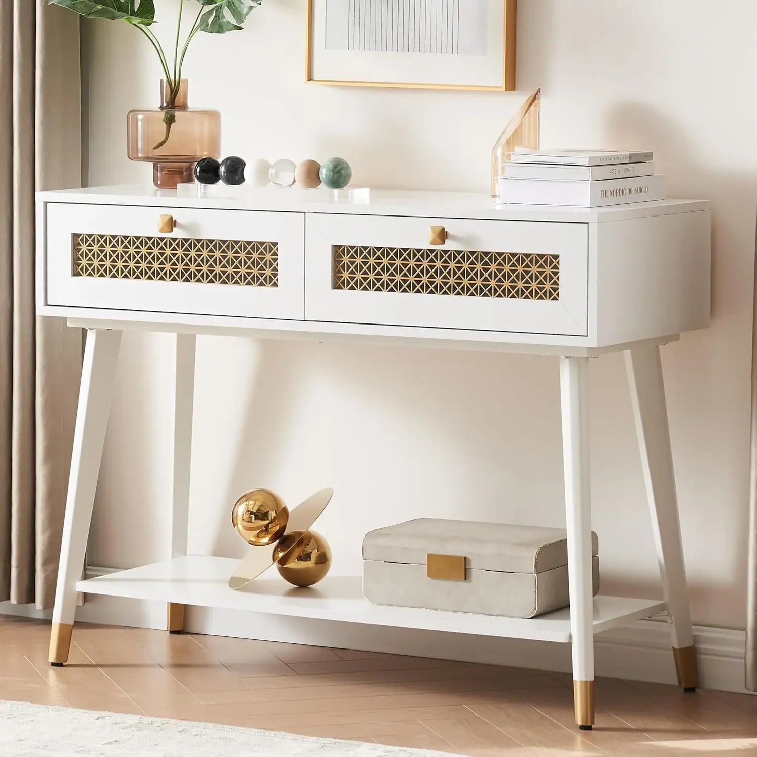 This 42" Mid Century Modern Console Table blends sleek design with practical functionality. Crafted from high-quality engineered wood, it features smooth lines, tapered metal legs with anti-slip feet, and metal drawer handles for a refined look. With ample storage provided by its drawers and open shelf, it helps keep your space organized while enhancing any room’s style. Perfect behind a couch, in a hallway, or office, this versatile table offers both elegance and stability for your home.