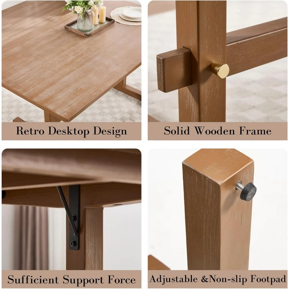 This 63" farmhouse dining table combines rustic charm with practical design, comfortably seating 4 to 6 people. Crafted from solid wood, its rectangular shape offers ample space for meals and gatherings. Perfect for both dining rooms and living areas, this table adds a warm, timeless character to your home with its sturdy construction and understated elegance.