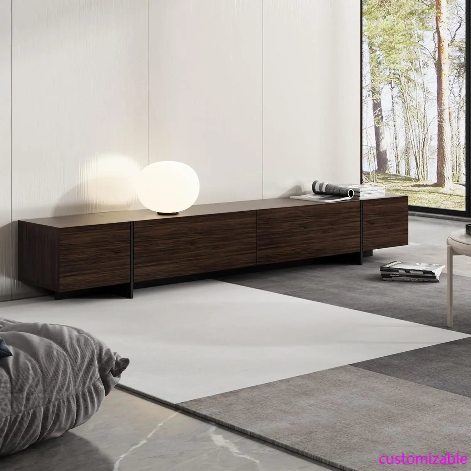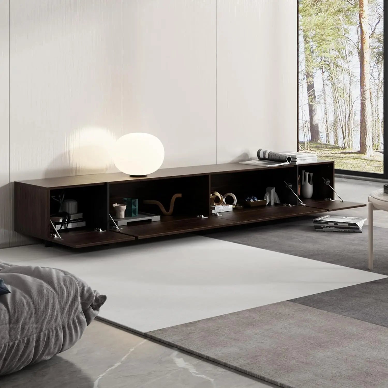 Presenting a sleek 95" Entertainment in a rich dark brown finish, designed to elevate your living space. This modern entertainment center features four flip-down drawers that offer concealed storage, keeping media accessories organized and out of sight. Its expansive surface accommodates large televisions while adding refined elegance to your home. Combining functionality with clean lines, this media console table seamlessly integrates style and practicality for a sophisticated centerpiece.