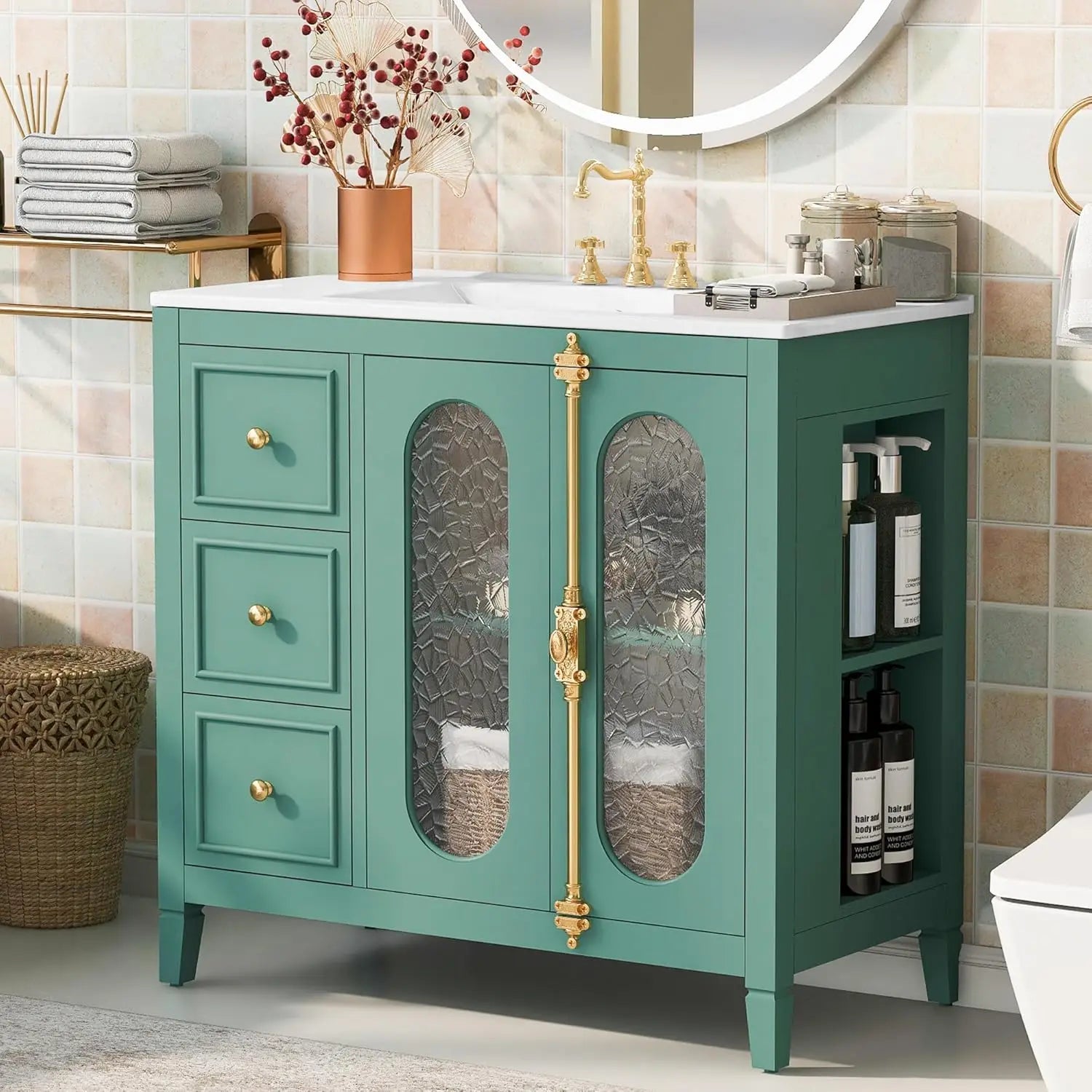This French Vintage Bathroom Vanity with Sink exudes timeless elegance, blending classic design with practical functionality. Crafted to bring a refined charm to your bathroom, it offers ample storage beneath a graceful sink, perfect for organizing essentials while enhancing your space's aesthetic. Its vintage-inspired details and quality finish create a sophisticated focal point, elevating the ambiance with subtle luxury. Ideal for those seeking to combine style and utility in their bathroom décor.
