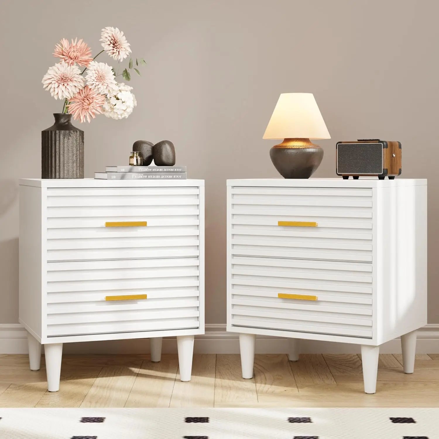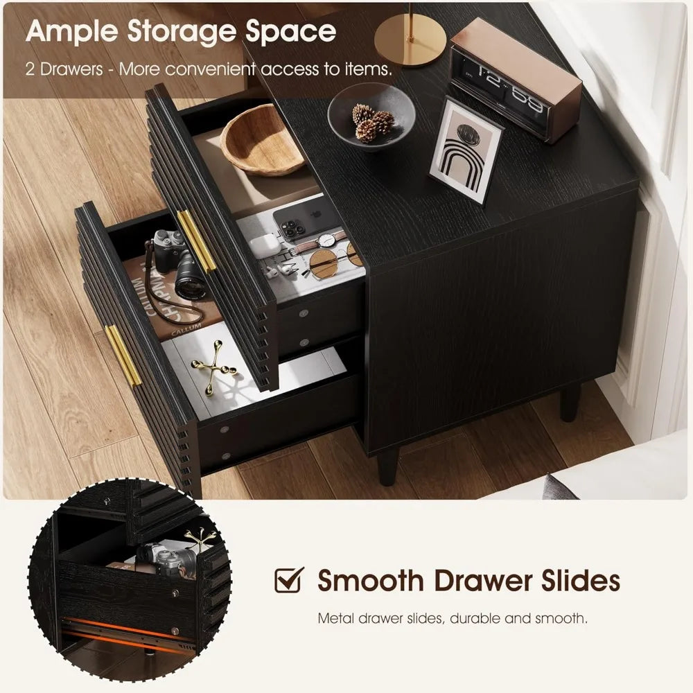 Enhance your bedroom with this set of two Mid Century Modern fluted nightstands, designed to blend timeless elegance with practical functionality. Featuring distinctive fluted detailing and a sleek silhouette, these nightstands provide ample storage while elevating your space’s aesthetic. Crafted for durability and style, they offer a refined touch to complement your modern décor effortlessly.