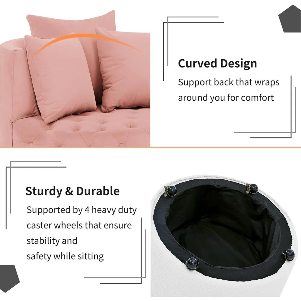 Indulge in luxury with our Swivel Barrel Accent Chair. This 30” modern velvet round sofa chair is designed for comfort and style, featuring 3 plush pillows and wheels for easy mobility. Sink into the plush, tufted cushions of this exclusive club lounge chair and elevate your living space.